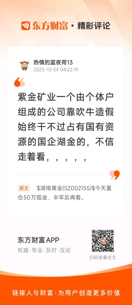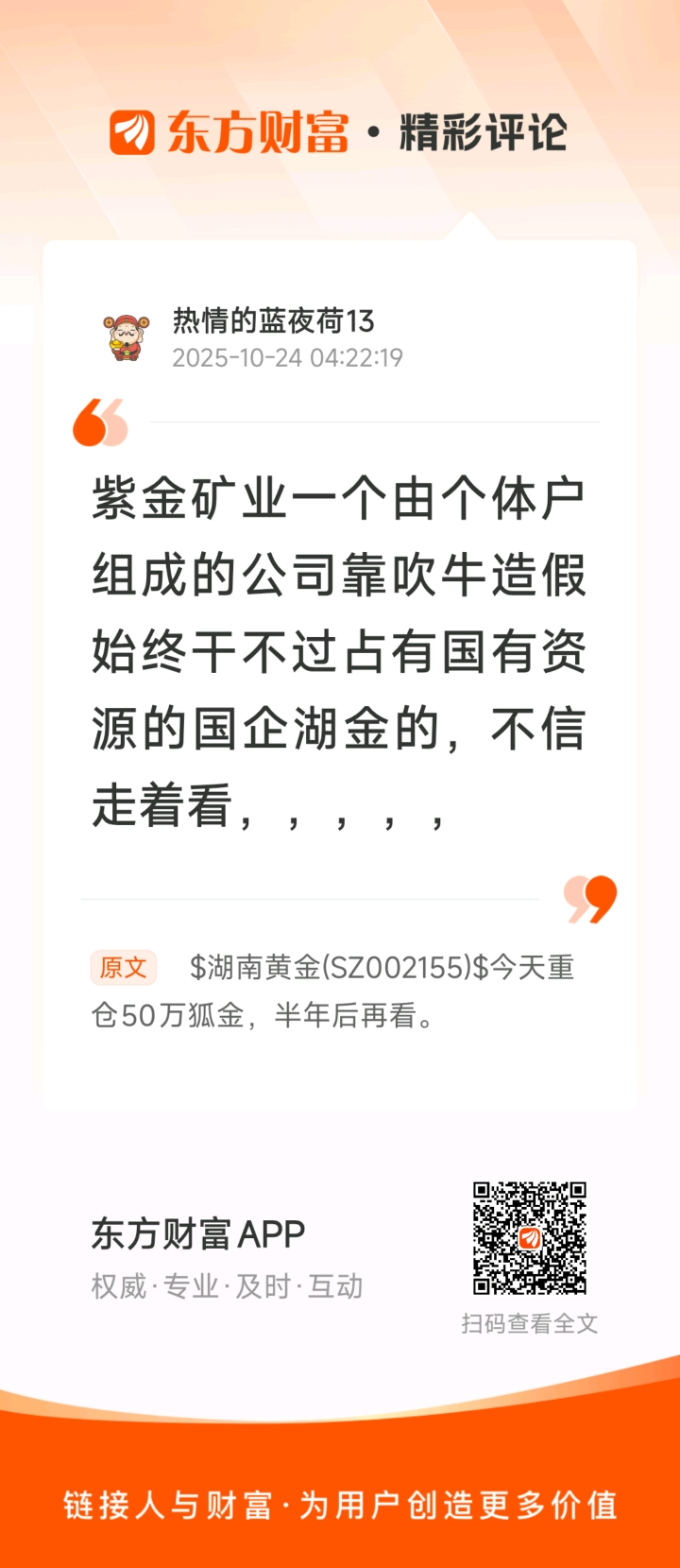 什么垃圾,还想碰瓷紫金?你就老老实实在这里呆着补仓到老//@热情的蓝夜荷13 :紫金矿业一个由个体户组成的公司靠吹牛造假始终干不过占有国有资源的国企湖金的,不信走着看,,,,,