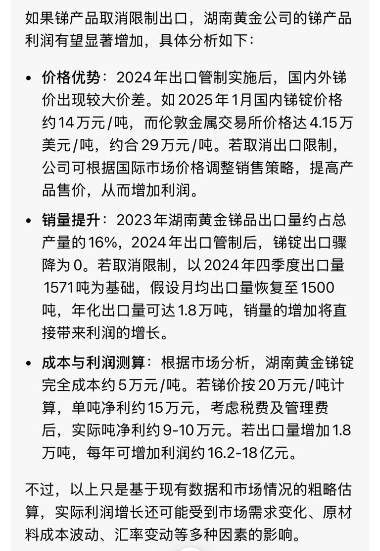 $湖南黄金(SZ002155)$ 这次放开后按照2023年的销量计算,锑价格按照最低价格20万一吨卖出去,每年可增加近18亿元纯利润,比2024年全年利润翻番了