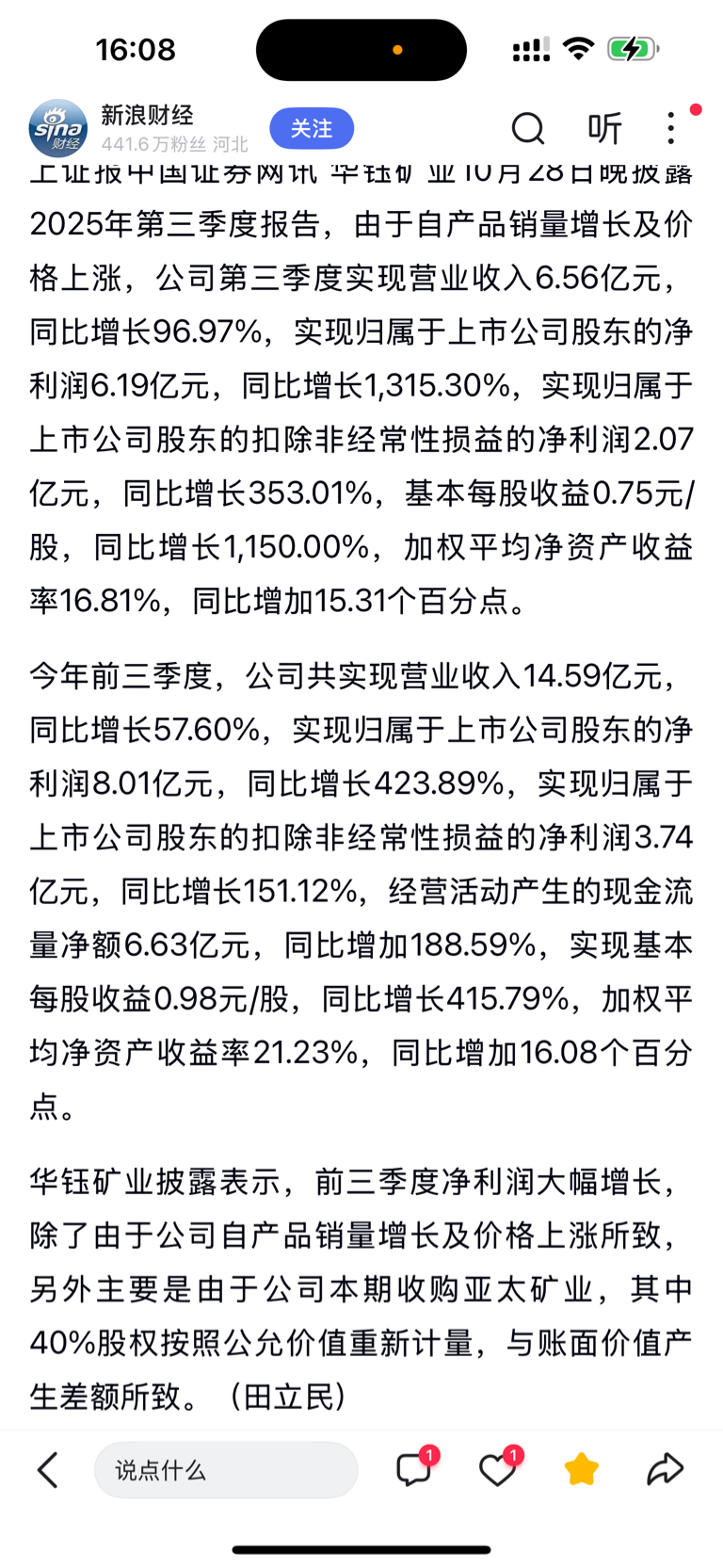 $湖南黄金(SZ002155)$ 华钰矿业第三季度归属于上市公司股东的净利润6.19亿元大幅同比增长1,315.30%,主要是由于公司本期收购亚太矿业,其中40%股权按照公允价值重新计量,与账面价值产生4.12亿元差额所致,归属于上市公司股东的扣除非经常性损益的净利润仅为2.07亿元。