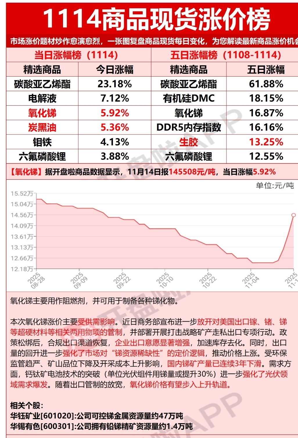 从锑价上涨的驱动来看,湖南黄金作为国内锑矿龙头(年锑金属产量约3.5万吨),锑价每涨1万元/吨,毛利润可增加约3.5亿元,本次锑价(氧化锑)单日涨5.92%、五日涨16.87%,叠加出口管制放松、供需缺口扩大(光伏/半导体需求+供给收缩),会直接提升公司业绩预期。