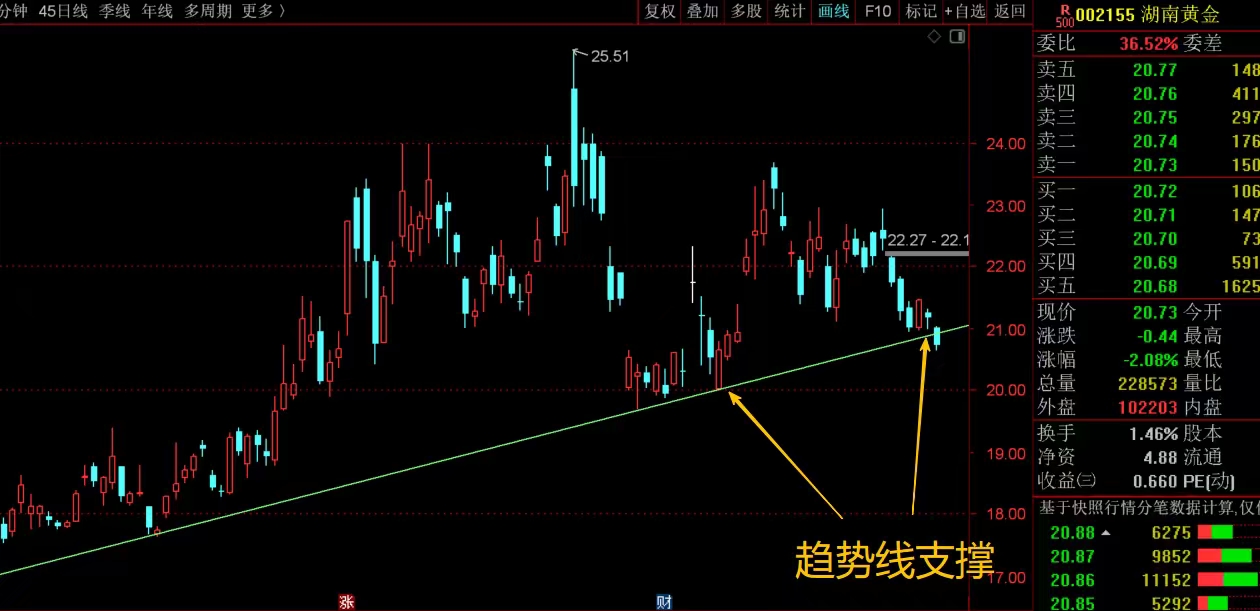 $湖南黄金(SZ002155)$ 近期走势偏弱,主要是回落反弹后,再次回落下来,今天跌破了中期上来的趋势线支撑,接下来重点就主要看这个趋势线区域的得失了,能稳住都好说,继续看震荡,但有效跌破就要注意破位风险了,需要严格控制仓位应对潜在的大幅下杀。#复盘记录# #炒股日记#