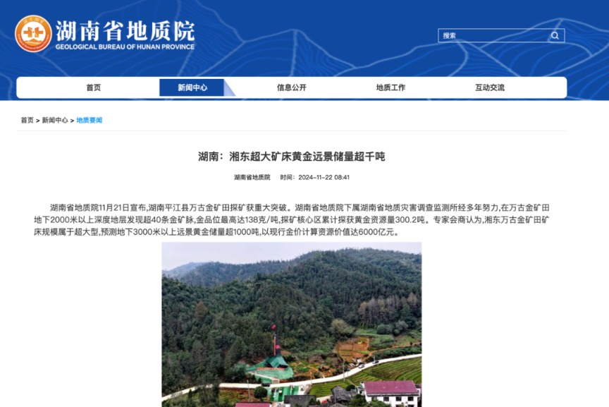 若交易完成,湖南黄金有望进一步掌控湖南平江万古矿区。2024年11月,湖南省地质院宣布,湖南平江县万古金矿田探矿获重大突破。湖南省地质院下属湖南省地质灾害调查监测所经多年努力,在万古金矿田地下2000米以上深度地层发现超40条金矿脉,金品位最高达138克/吨,探矿核心区累计探获黄金资源量300.2吨。专家会商认为,湘东万古金矿田矿床规模属于超大型,预测地下3000米以上远景黄金储量超1000吨,以当时金价计算资源价值达6000亿元。