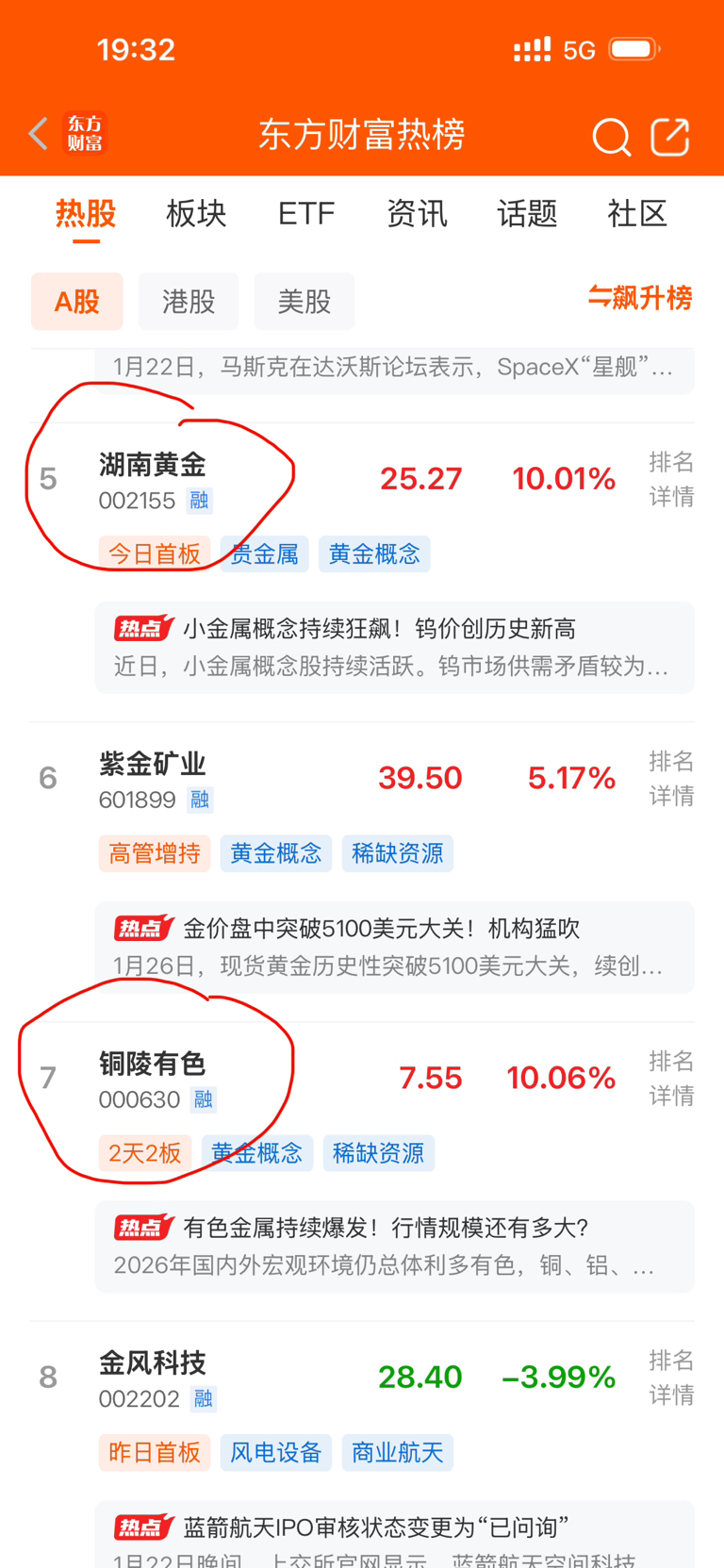 人气榜前10名,我居然买中2个:第5名的湖南黄金和第7名的铜陵有色……