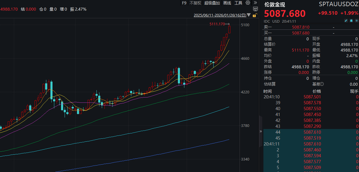 2026年1月26日,全球贵金属市场迎来历史性时刻——现货黄金价格首次突破5000美元/盎司,创下历史新高。与此同时,白银、铂金等贵金属价格同步飙升,带动A股黄金概念股集体走强,湖南黄金、招金黄金、中国黄金、四川黄金等多只个股高开高走。