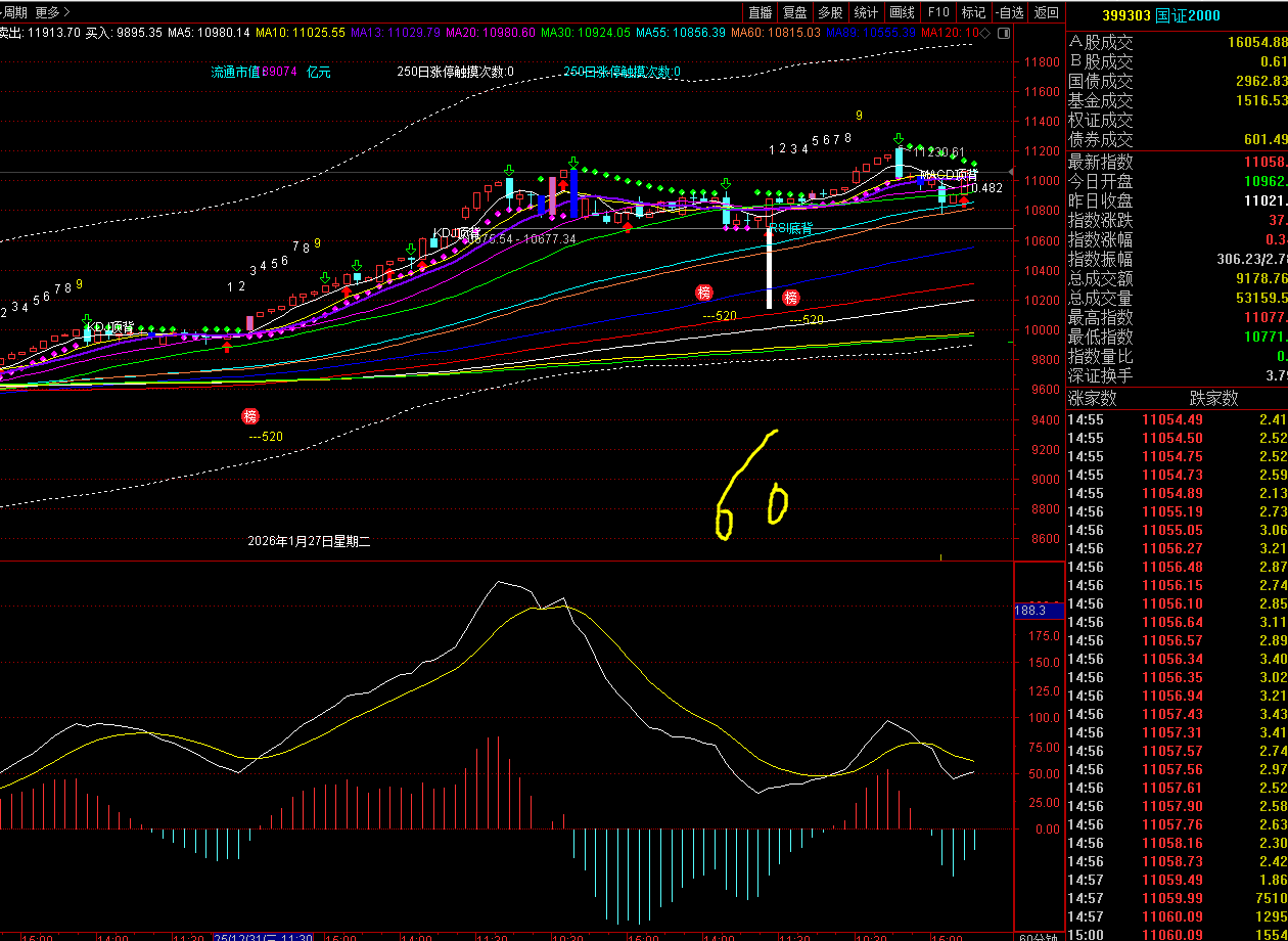 我们再来讲一下国证2000,通过国证2000指数去看盘,明天通过60分钟看国证2000的指数,明天盘面当中大概率是中小市值的品种上涨会多一点,60分钟和120分钟来看国证2000指数都是有反弹的需求,但是通过日K线去看国证2000也走不远,日线既然走不远,60和120分钟有反弹那不就是震荡吗,国证2000指数60分钟是底背离