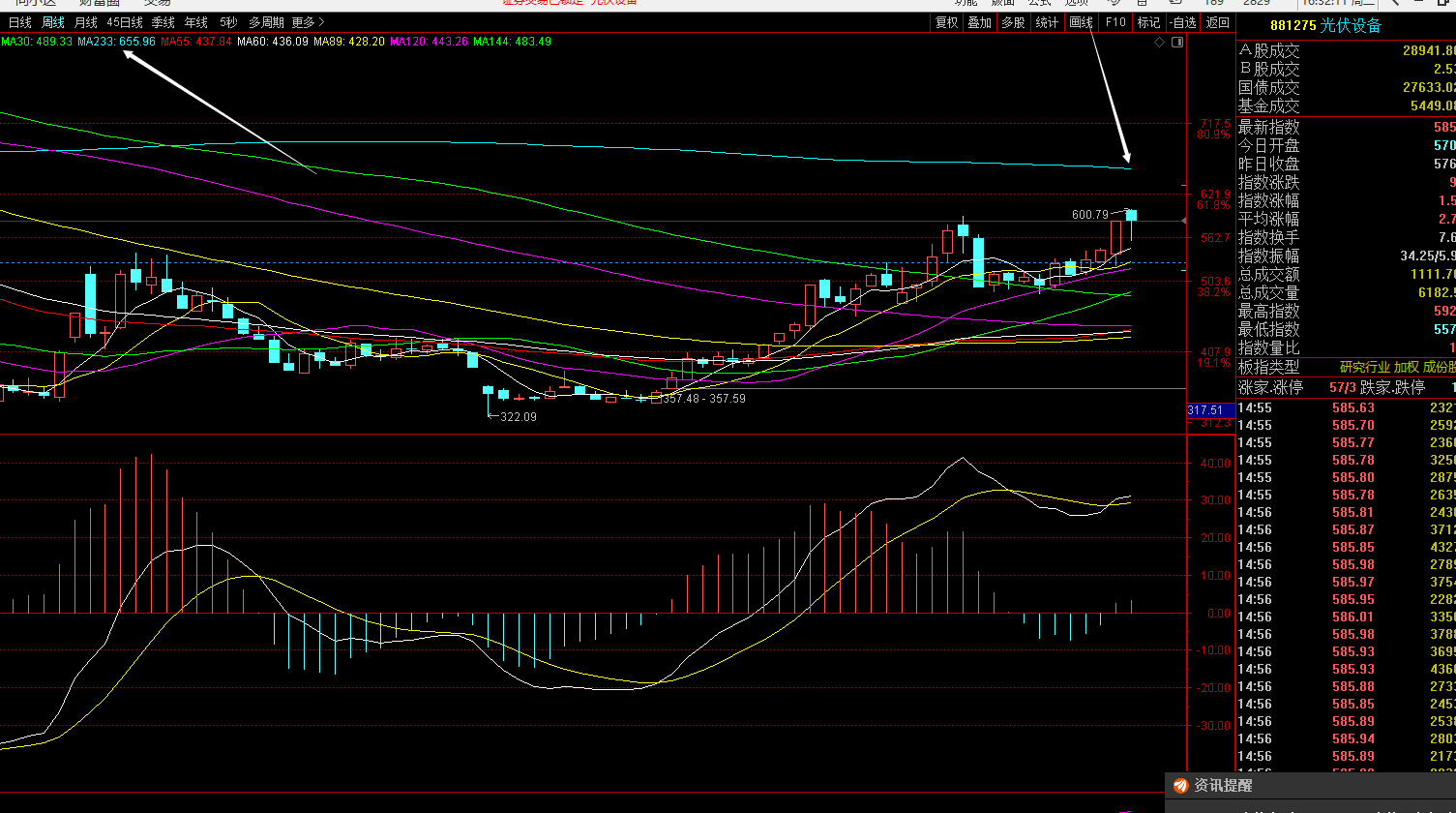 最近给大家讲的最多的就是软件和光伏设备,光伏设备在上星期五大涨之后,昨天我在直播间给大家讲到这个地方今天或者明天会回踩一下5天线,今天光伏设备刚好回踩5天线就起来了,光伏设备的位置我是坚定看多,看到这次反弹650点左右,现在收盘点位585点,光伏设备是电气设备的细分,电气设备电力这个都是算力的下游产业,2026年我看好的就是软件和电气设备这个方向。