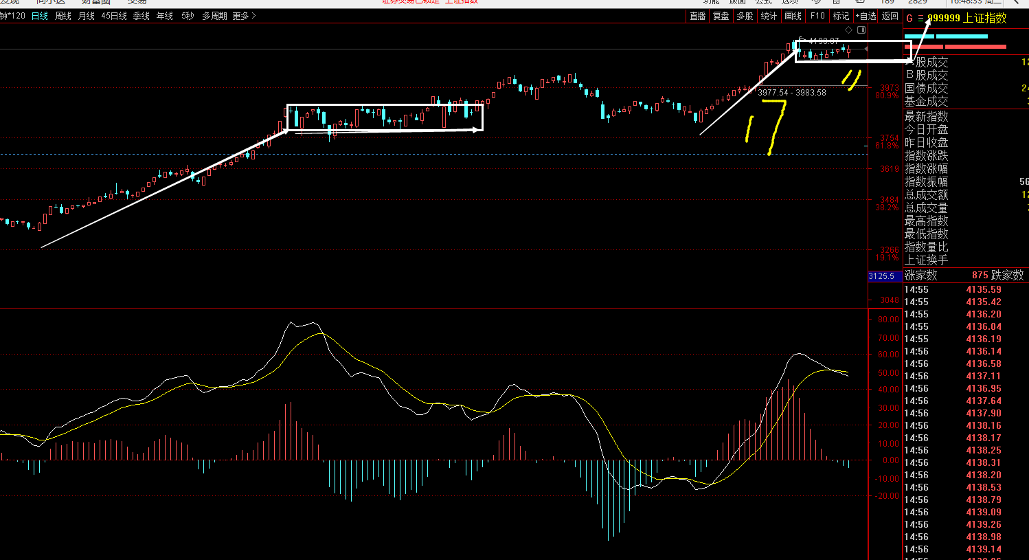 周末的文章预测星期三或者星期四会攻击4200点,从目前的这个盘面当中来看不一定会完成,可能会落空,昨天指数出现了冲高回落,昨天我在文章里面给大家讲到今天指数支撑位是4100点,今天的最低点4101点这还是符合预期的,说了不排除今天或者明天会去一下4080点,通过今天的盘面来看4100点就是这一次回调的支撑位,4080点都不一定会去,今天中午在直播当中给大家讲到下午中小市值的品种会拉起来,今天下午果然拉起来了,今天全天都是白线在上黄线在下,下跌的个股将近3500家,明天盘面当中会反过来,明天很有可能全天会是三七开,可能会是7成的个股上涨三成的股票下跌