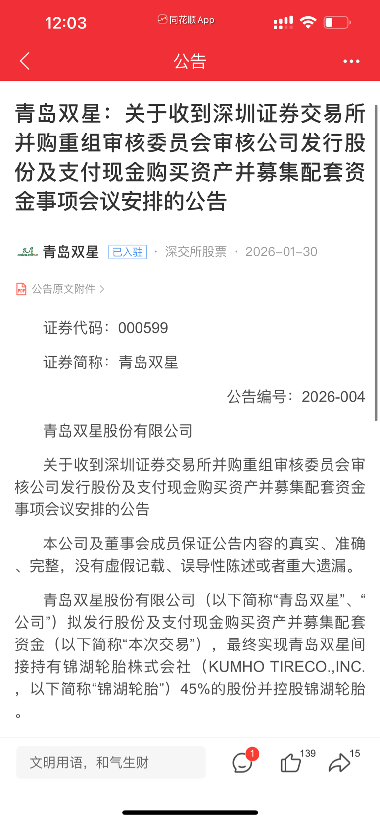 $湖南黄金(SZ002155)$ 能不能回本你们自己把握 青岛双星 发布上会重组 快停牌了