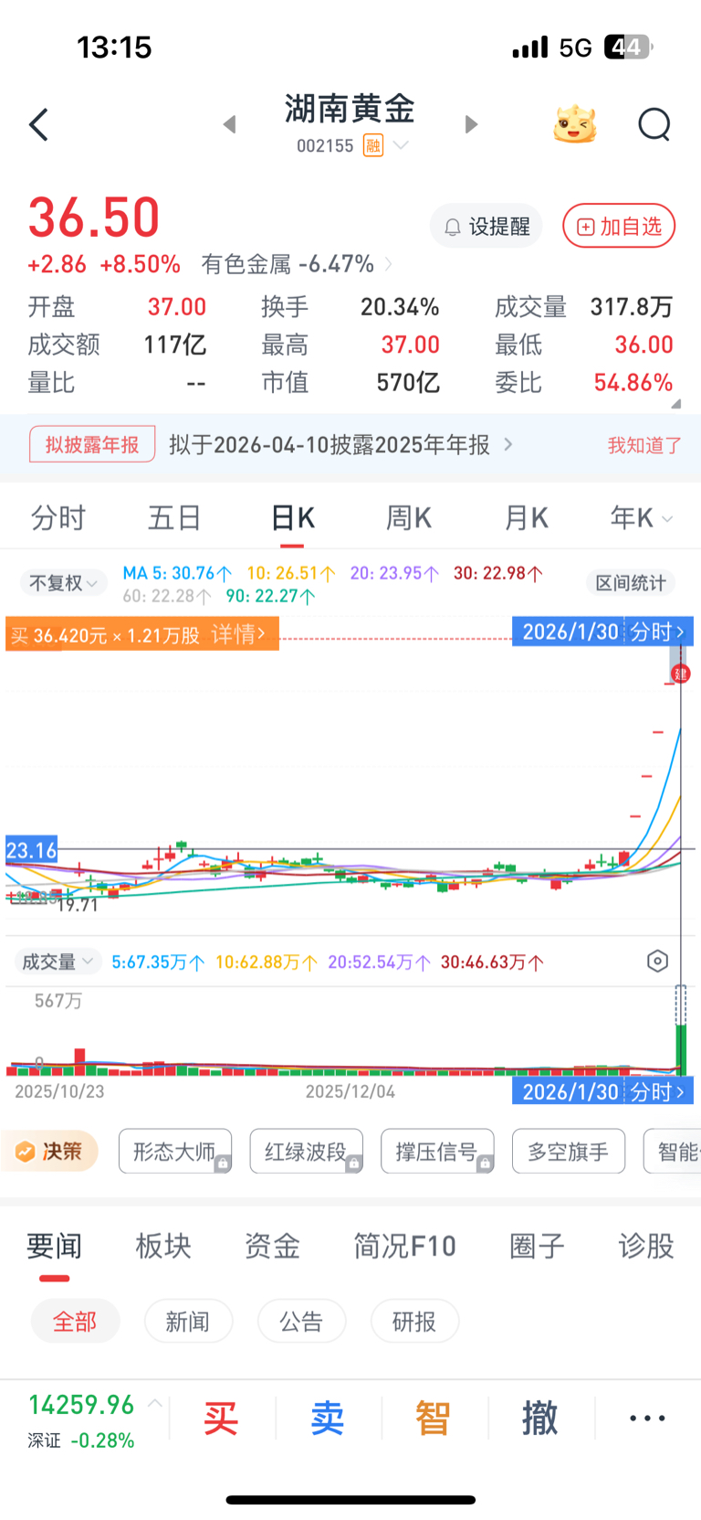 $湖南黄金(SZ002155)$ 剩的仓位不多,全进来了,也是今天情绪杀,不然根本没机会