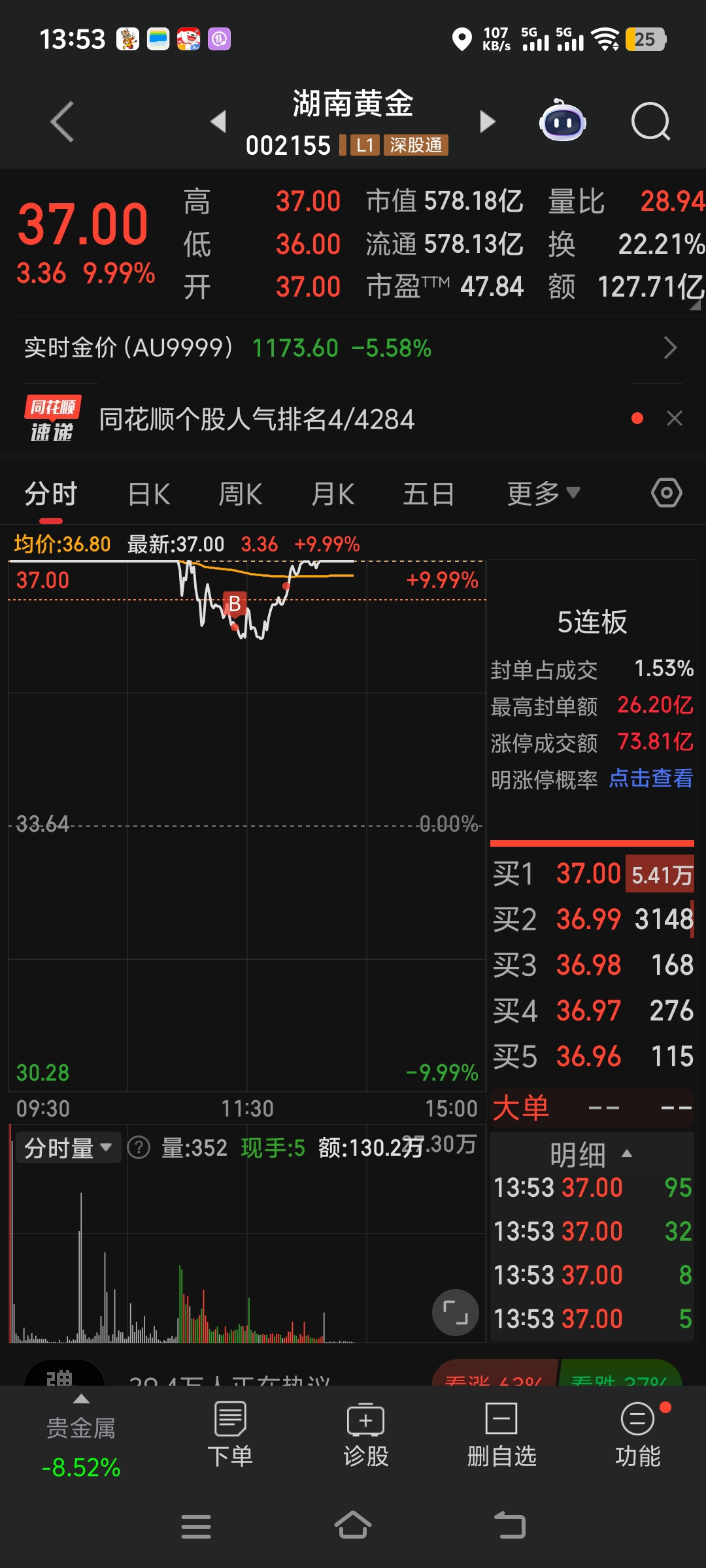 $湖南黄金(SZ002155)$ $白银有色(SH601212)$ 尽力而为,能不能顶住就看主力的了,助力龙头,向多头致敬