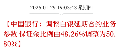1月29日A股收盘后,一则来自金融机构的调整消息迅速引发市场关注。中国银行根据上海黄金交易所(简称“上金所”)发布的风险防控通知,对代理个人上金所业务项下的白银延期合约交易参数进行调整。