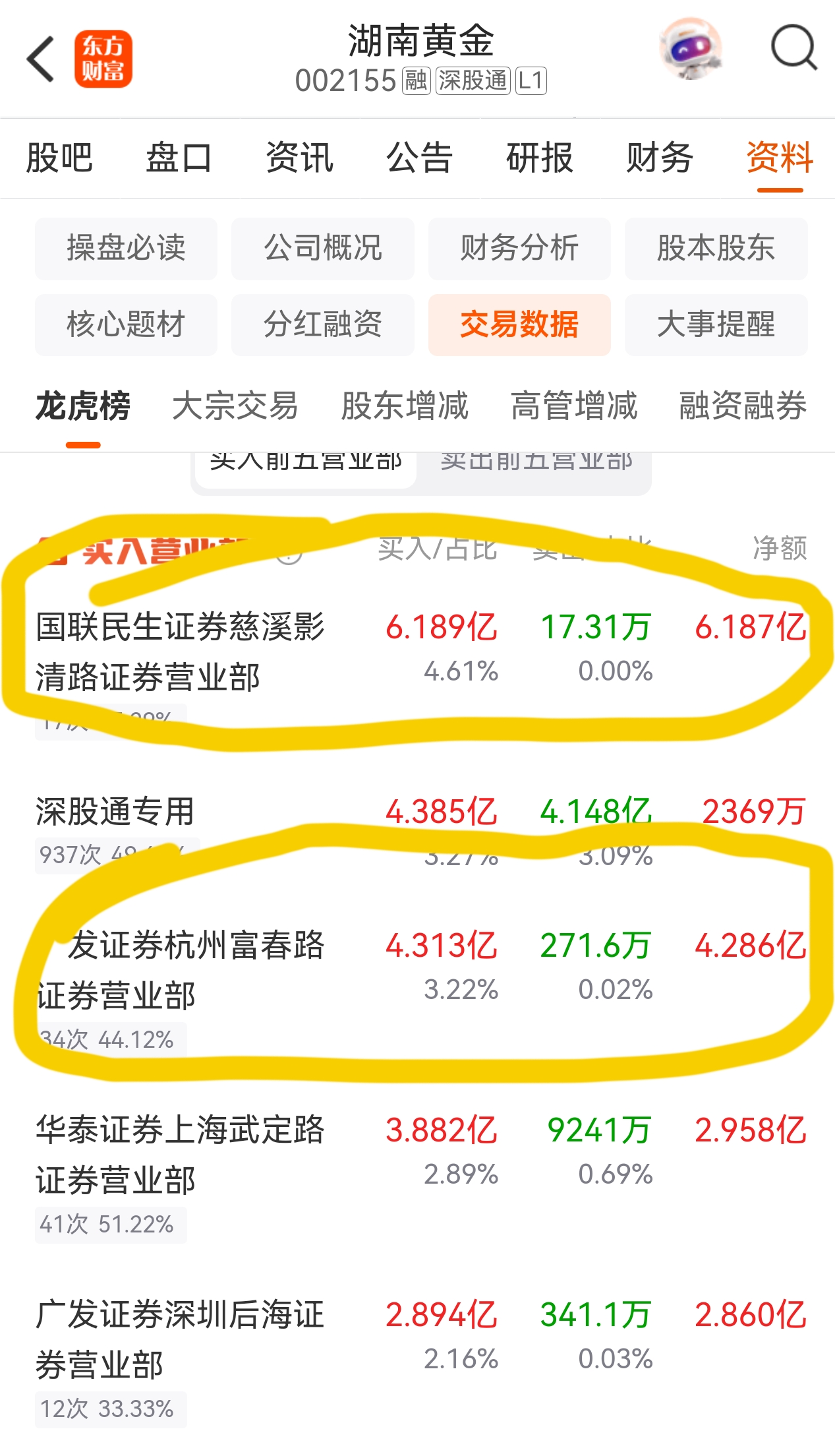 $湖南黄金(SZ002155)$ 这两个席位不知道是谁的掩护手。下个交易日看跌
