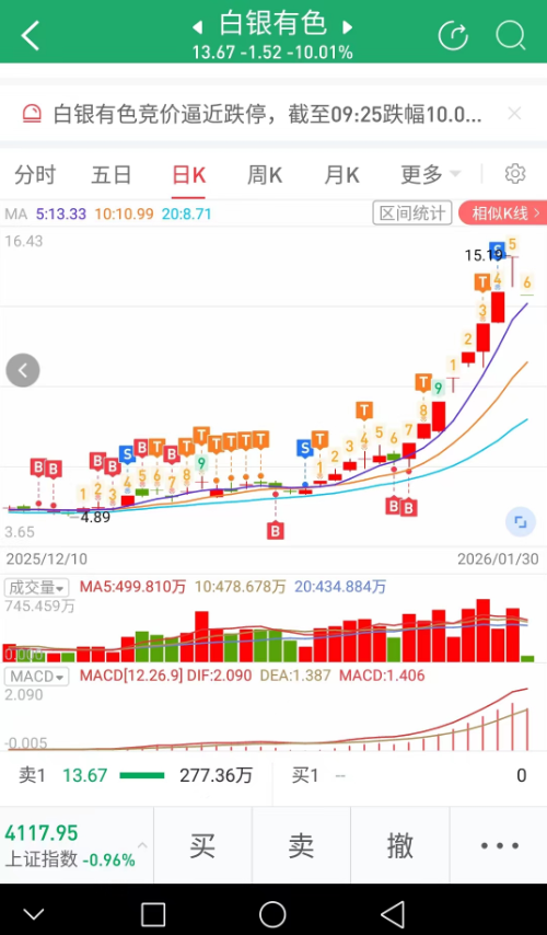 本人刚刚在白银有色吃了8个涨停!!!且在白银有色第7个涨停时及时卖出部分!!!今日早盘宁愿不加仓利欧过来!!!