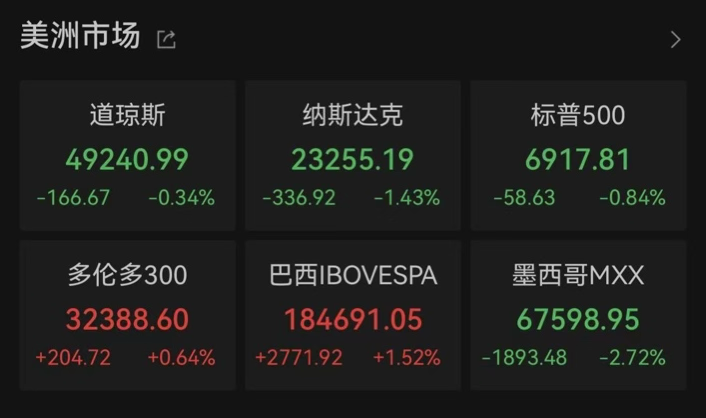 截至当地时间周二收盘,美国三大股指全线下跌。道指跌0.34%报49240.99点,标普500指数跌0.84%报6917.81点,纳指跌1.43%报23255.19点。