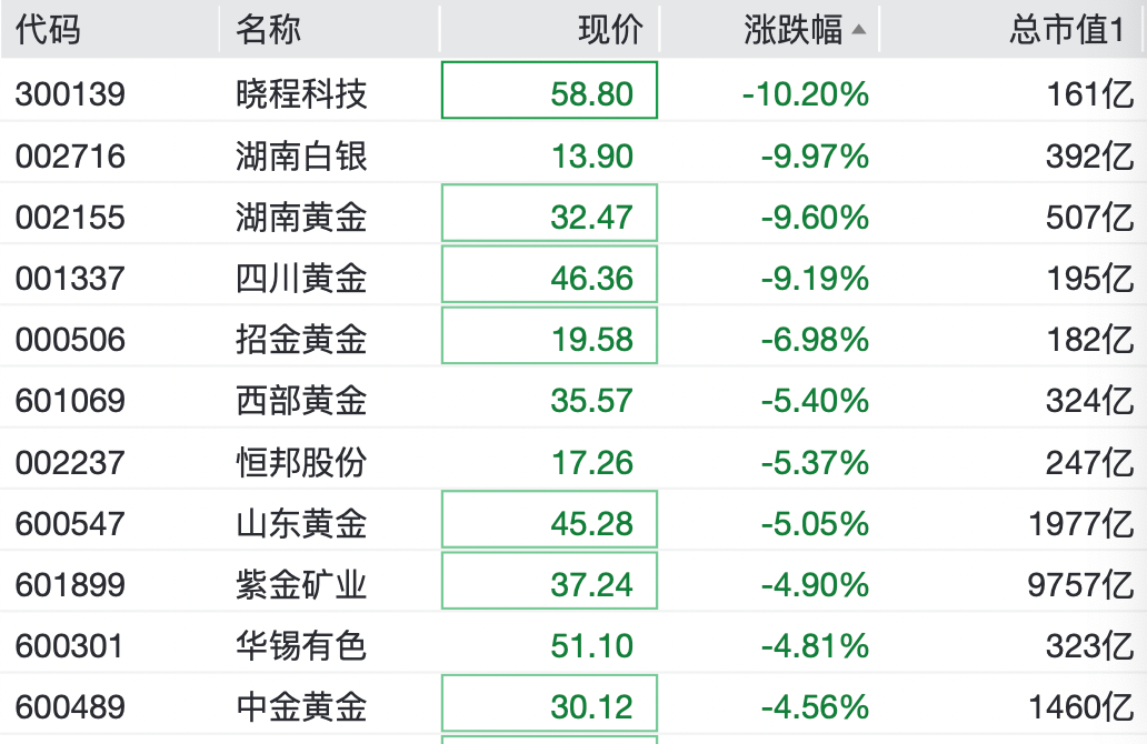 A股方面,贵金属板块开盘跌幅靠前。湖南黄金、湖南白银一度录得10cm跌停。晓程科技跌超10%,四川黄金跌超9%,招金黄金、西部黄金等纷纷下跌。