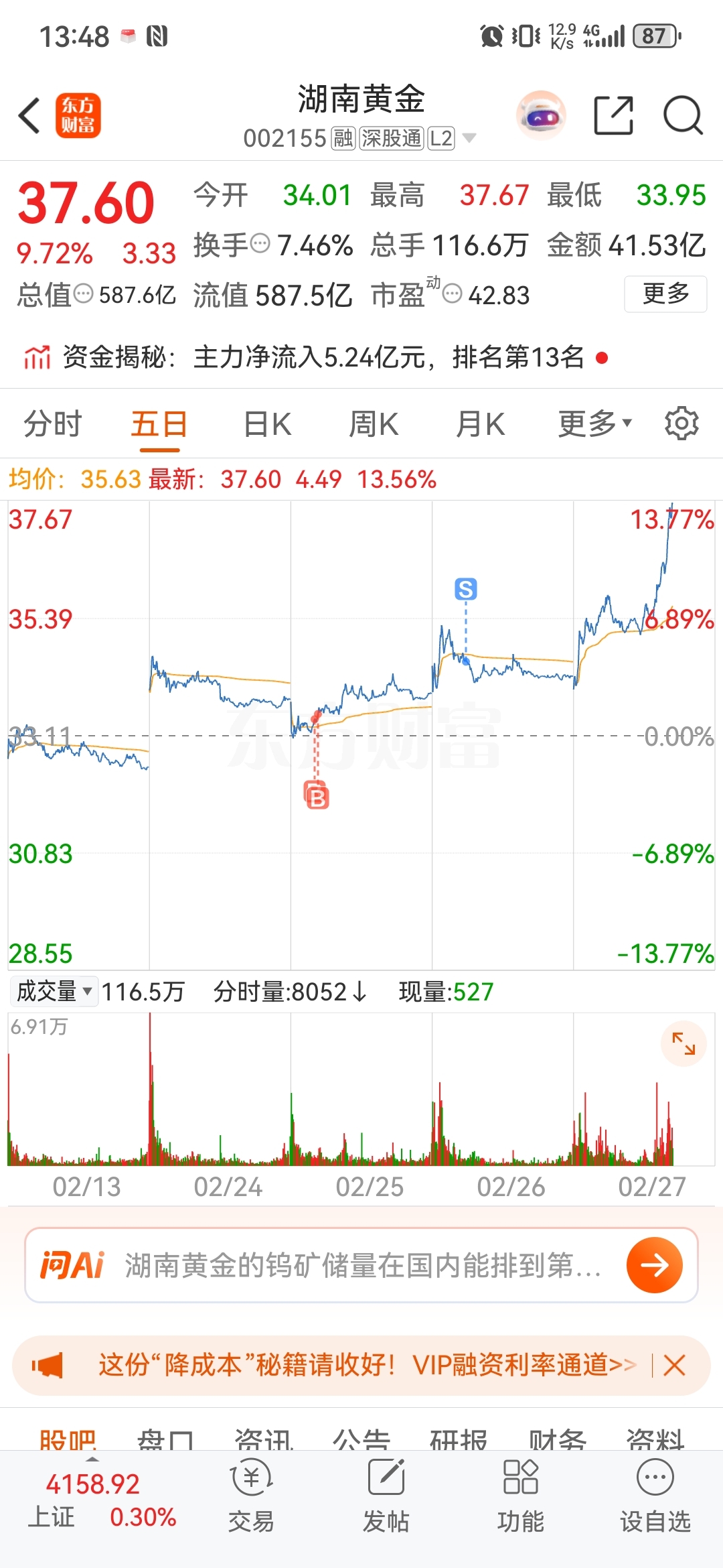$湖南黄金(SZ002155)$ 昨天一天卖飞几只涨停