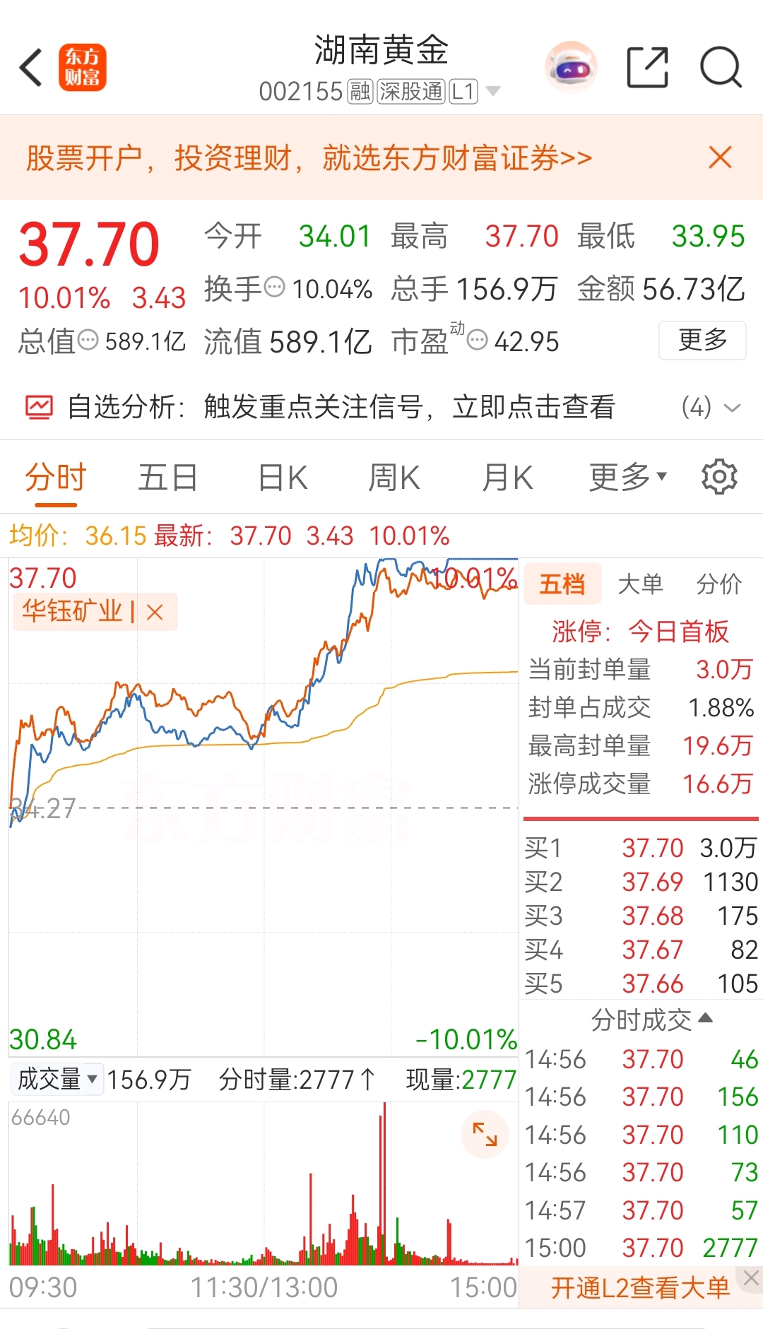 看图形叠加,今天的走势和华钰矿业几乎同频,而且上午湖南黄金还是跟随者,到了午后一