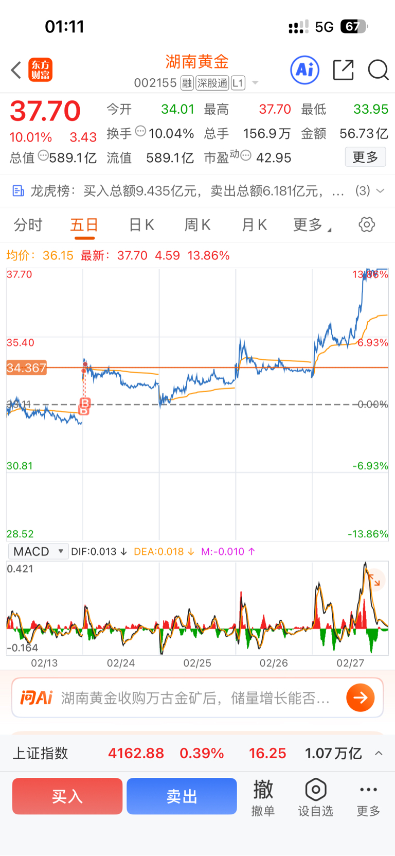 $湖南黄金(SZ002155)$ 一个小小的涨停就跑到东财前三了,周一该怎么办啊