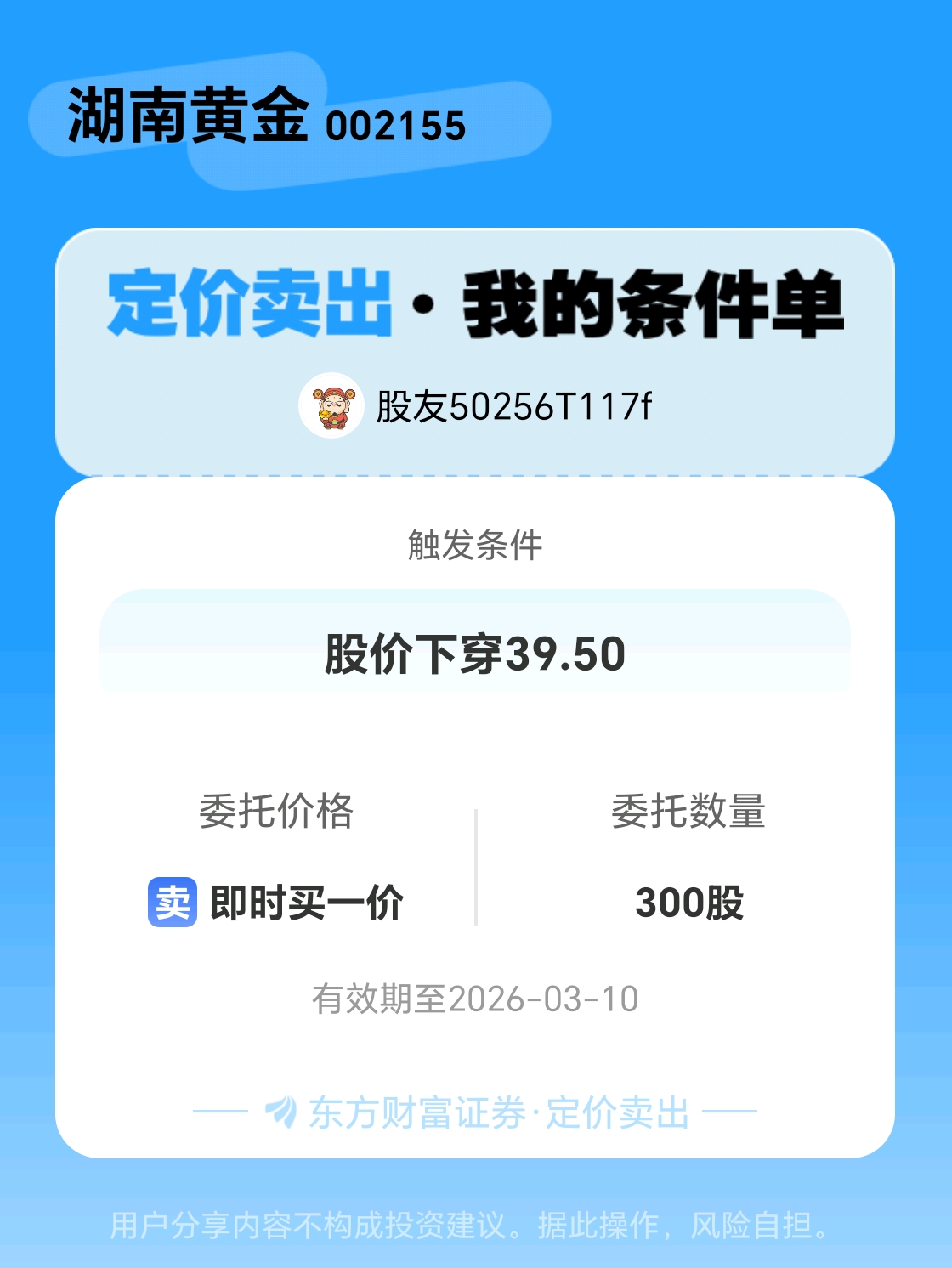 #条件单交流# #定价卖出晒单# 一位股神设置了一个定价卖出条件单,接下来就是见证奇迹的时刻~$湖南黄金(SZ002155)$