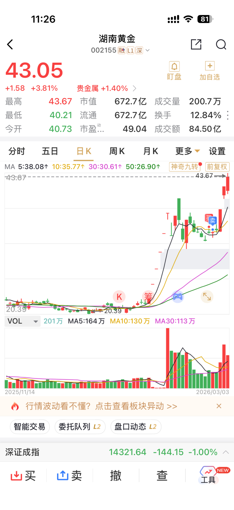 $湖南黄金(SZ002155)$ 卖飞了啊