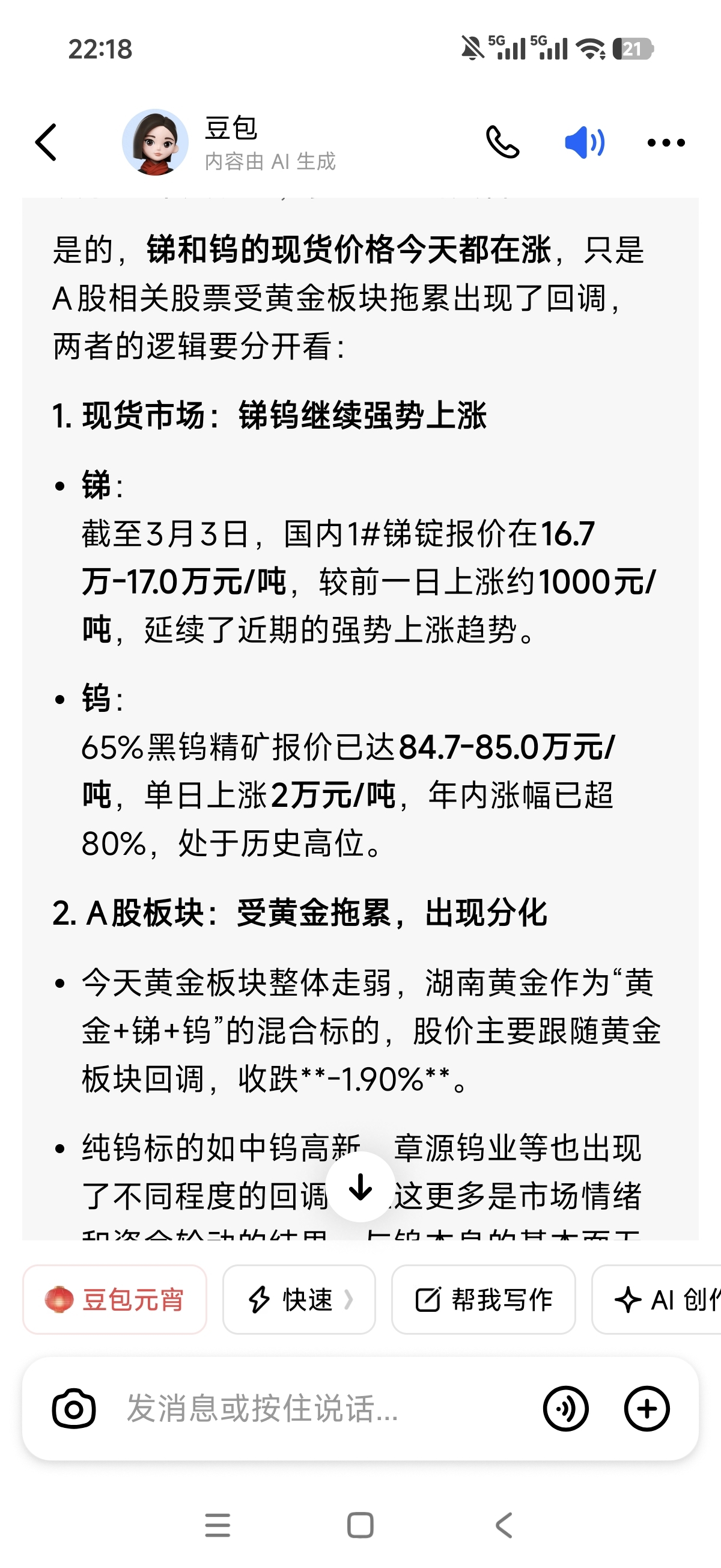 今天锑钨都大涨,但是股价主要跟黄金,今天金价在反弹,如果今天跌的不多,加上锑钨上