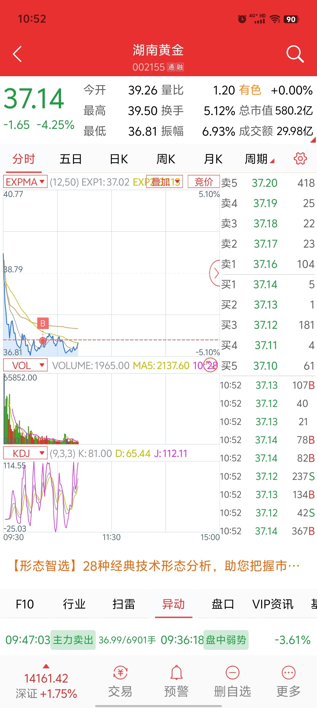 $湖南黄金(SZ002155)$ 昨天在四川黄金做个踢,谁知道那家伙不跟黄金板块走,卖飞了,今天没买点,看到湖南黄金在低位就进来了。还好都是黄金股。