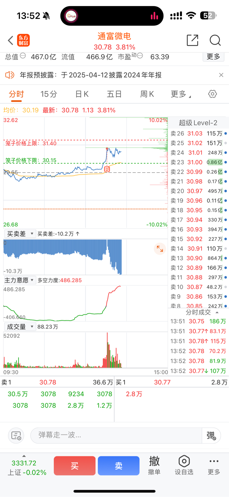 $通富微电(SZ002156)$ 傻了,忘记开委托柱了,30.99 和 31 有机构两亿左右的压单,涨不起来了的