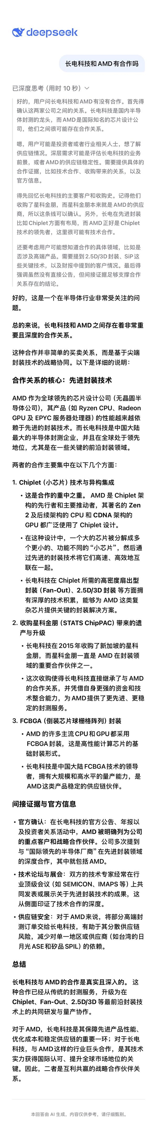 Deepseek回复:长电科技与AMD合作是真实深入的。
