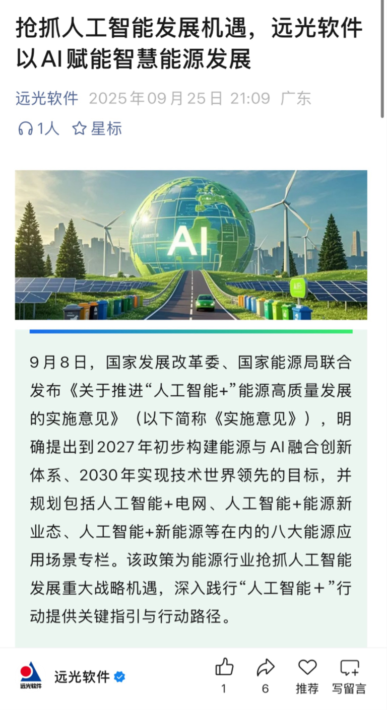 《实施意见》的出台,标志着能源行业全面进入“AI驱动”时代。远光软件将持续深化AI技术在能源场景的应用,在智能调度、低碳转型、多能互补等领域加速创新突破,助力能源行业实现绿色低碳转型和高质量发展。