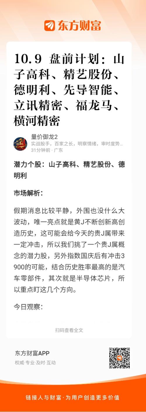假期消息比较平静,外围也没什么大波动,唯一亮点就是黄J不断创新高创造历史,这可能会给今天的贵J属带来一定冲击,所以我们挑了一个贵J属概念的潜力股,另外指数国庆后有冲击3900的可能,结合历史胜率最高的是汽车零部件,其次就是半导体芯片,所以重点盯这几个方向。