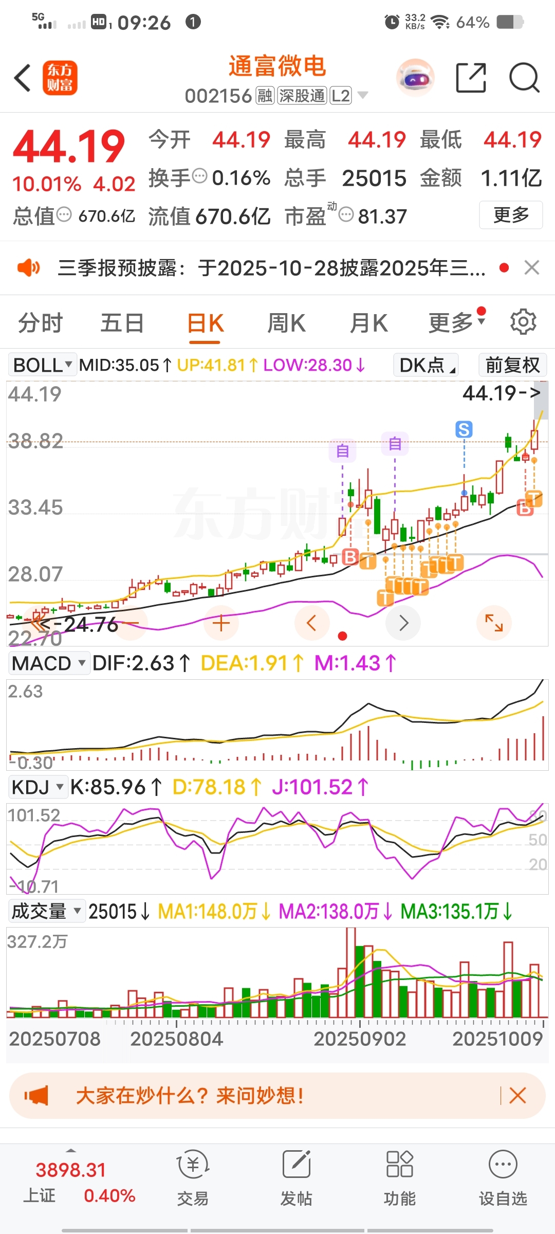 $通富微电(SZ002156)$ 靠,这泼天的富贵总算轮到我了,我还是因为总舵主买入才关注到这个票,从第一波突破回踩整整熬了我一个月,第一波埋伏早了,这第二波不早不慢可算轮到我了,6000%封单,封单这么大,要3个板起步了