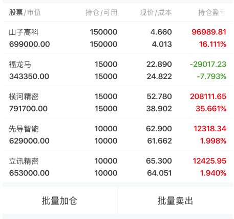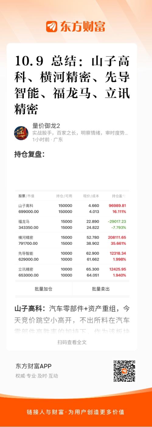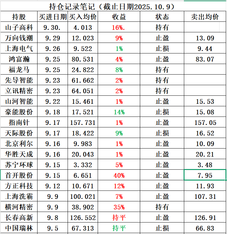 月总结:很感谢这段时间粉丝们对我文章的关注和喜欢,股市这么多年,大起大落,经历过各种阶段,股市需要找到适合你自己的一条方法,然后反复打磨,精益求精,就像我今日选择了短线波段,那么就只最求强势和有主丽参与的,希望大家也能找到自己的路,另外这周行情整体还是不错的,首先前期我们抓了首开,吃到一波大肉,包括横河精密9月初也吃了20CM,方正科技等等,固态电池和机器R算是跟对主线,9月结束,10月迎新,我们10月主线更加确定,而且我们已经提前布局,结合历史数据和大方向,10月板块特征是:科技、高端制造、医药领域领涨政策与产业驱动明显,细分到二级行业就是:半导体、其他电子、汽车零部件三个二级行业胜率高达100%,近5年都是这个胜率,所以10月可期,主线已定,就等我们携手共战了。记得留意文章。
