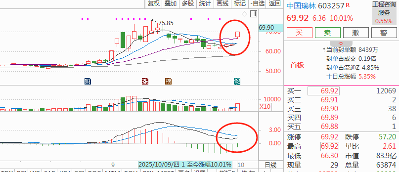 对标的是以上的稀土/锂电池题材,这个板块是昨天下午盘才出消息的,这个板块仅有三只涨停,最先上板的是安泰科技,按理最具辨识度,但是稀土的利好是午后才出现的,所以安泰科技有可能是跟随核电跟有色或者半导体上板的,排除这票之后,中国瑞林的卡点辨识度就出来了。中国瑞林是稀土采矿、选矿、冶炼全产业链的 “隐形冠军”,从矿山到冶炼厂,全产业链自主可控,成本比同行低 30%,公司自主研发的 “稀土萃取分离技术”,能把杂质含量降到 0.001% 以下,比国际标准还严苛 10 倍。其研发专利数量超 200 项,其中 “稀土钕铁硼磁体表面处理技术” 打破小日子企业垄断。公司客户包括华为、比亚迪、宁德时代、特斯拉、苹果,订单排到了 2026 年,出台的稀土管理条例严格准入管理,行业集中度将大幅提升,中国瑞林作为龙头企业将受益。此外,金属铜跟黄金概念也是近期热点,注意助攻效应,日线结构上出现明显的二波形态,均线系统也向上粘合,,MACD有望同步共振上行。