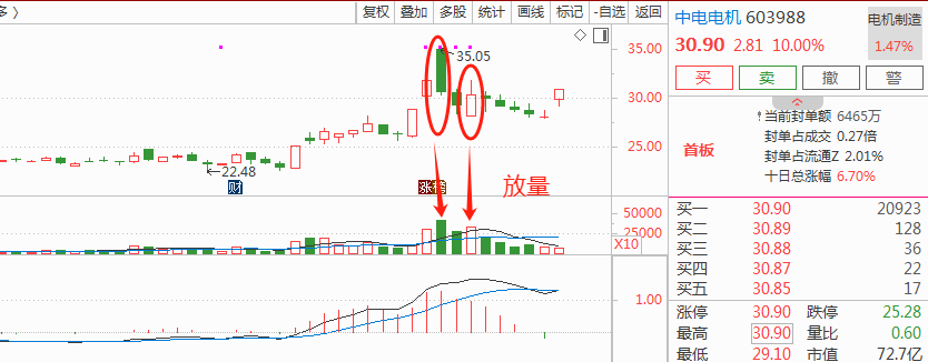 机电、风电板块,但昨天涨停的板块动力应该是储能跟新能源汽车属性。公司的主营业务是大中型直流电动机、中高压交流电动机、发电机、电机试验站电源系统和开关试验站电源系统等成套设备。中电电机日前完成新型大功率螺杆压缩机电机Y355-4 450kW 10kV 1485r/min IC01 IP23首批交付,该设备已在国内某新能源汽车领军和气投企业投入运行。公司全面推进陆上、海上风力发电机的多机型研发及量产、自主完成用于储能项目的发电机/电动机双运行状态无刷励磁同步机、水利项目低速永磁同步电机的研制,完成多款防爆电机及一级能效电机的研发,填补了公司在新领域、特殊工况行业的空白。公司业绩也是一大看点,上半年营收3.08亿元、同比增长21.94%,归母净利润3497.12万元,同比扭亏为盈。形态上亮点是9月19日跟9月23日两根阴阳K先,都是放量,一阴一阳说明后者在做承接,昨天涨停再次反包,显示19日的断头大阴实为洗碟子动作,今天继续阳线反包的话则这个逻辑更加夯实。
