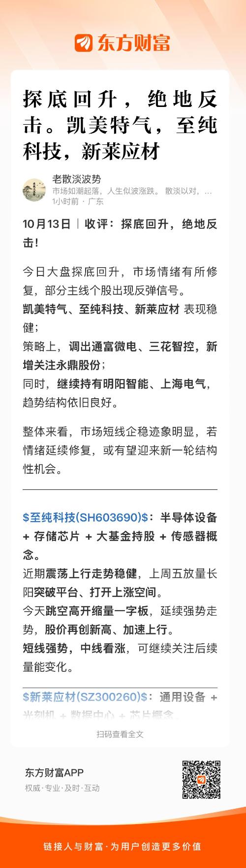 可看回早评 2025-10-13 可点>>> 机遇与风险并存。I.凯美特气 II.至纯科技 III.新莱应材