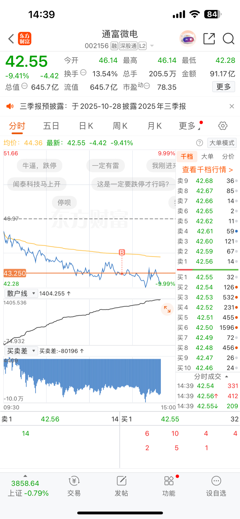 $通富微电(SZ002156)$ 我就买了1手,怎么就崩了