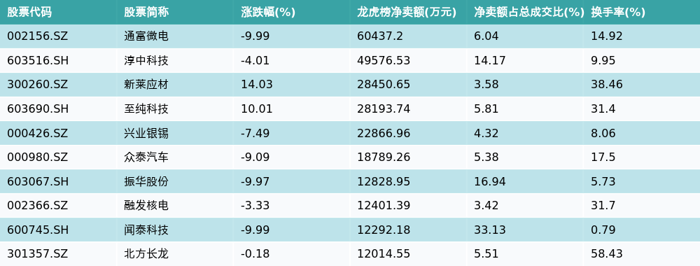 南财智讯10月14日电,南财金融终端数据显示,因当日异动登上龙虎榜的个股中,龙虎榜中资金净流出最多的前三位分别是通富微电(002156.SZ)、淳中科技(603516.SH)与新莱应材(300260.SZ)。其中排名第一的通富微电被净卖出6.04亿元,占总成交金额的6.04%。通富微电收盘下跌9.99%,换手率为14.92%。净卖出额前10个股详情见下图: