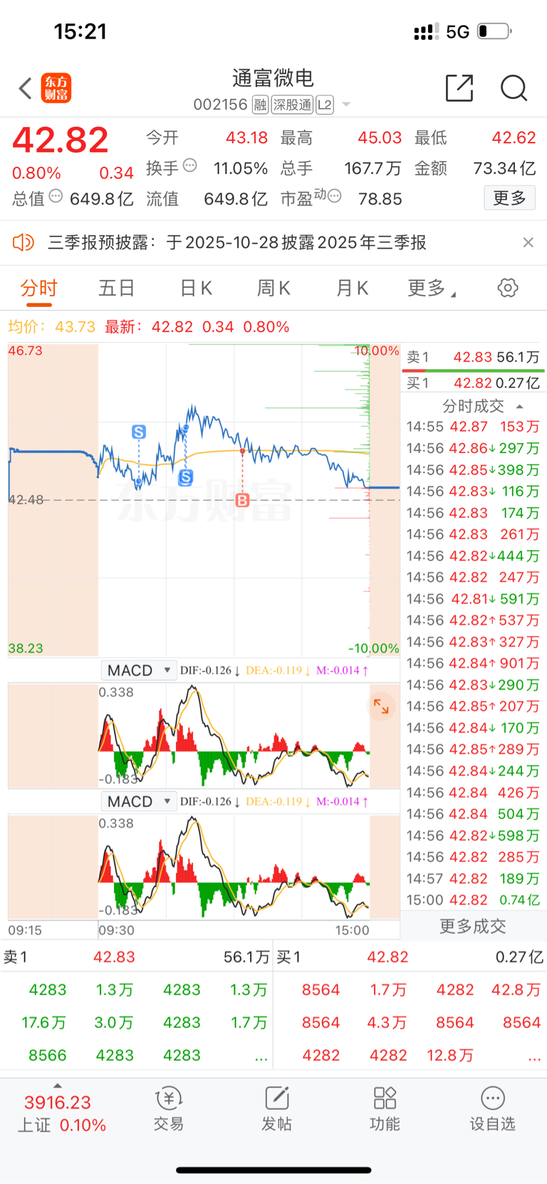 $通富微电(SZ002156)$ 全清了,买回了一手是想看看后面的走势,ADM大涨这边不认,资金还是谨慎的,毕竟两边关系很微妙,今天有资金想做多被砸晕了,明天做多的资金就是最大的空头,出来观望一下