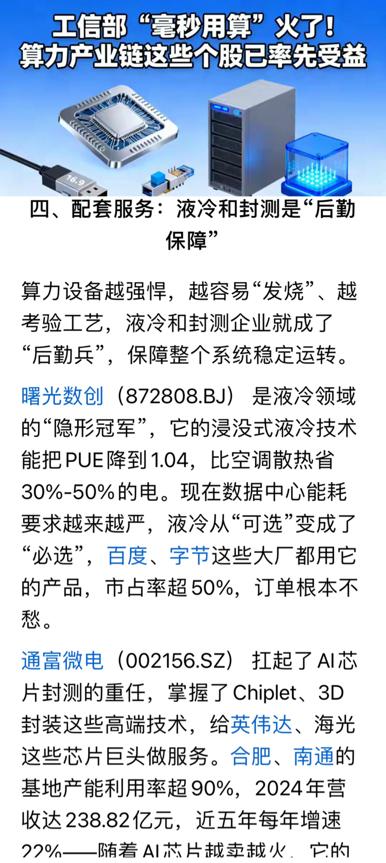 $通富微电(SZ002156)$ 工信部“毫秒用算”火了!算力产业链这些个股已率先受益,液冷和封测是“后勤保障”。#复盘记录#
