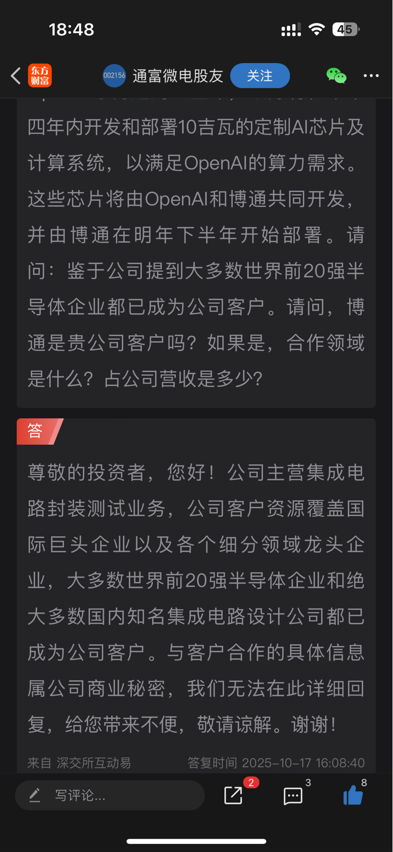 $通富微电(SZ002156)$ 这个董秘水平高!没有直接说消息不实,肯定就是公司机密