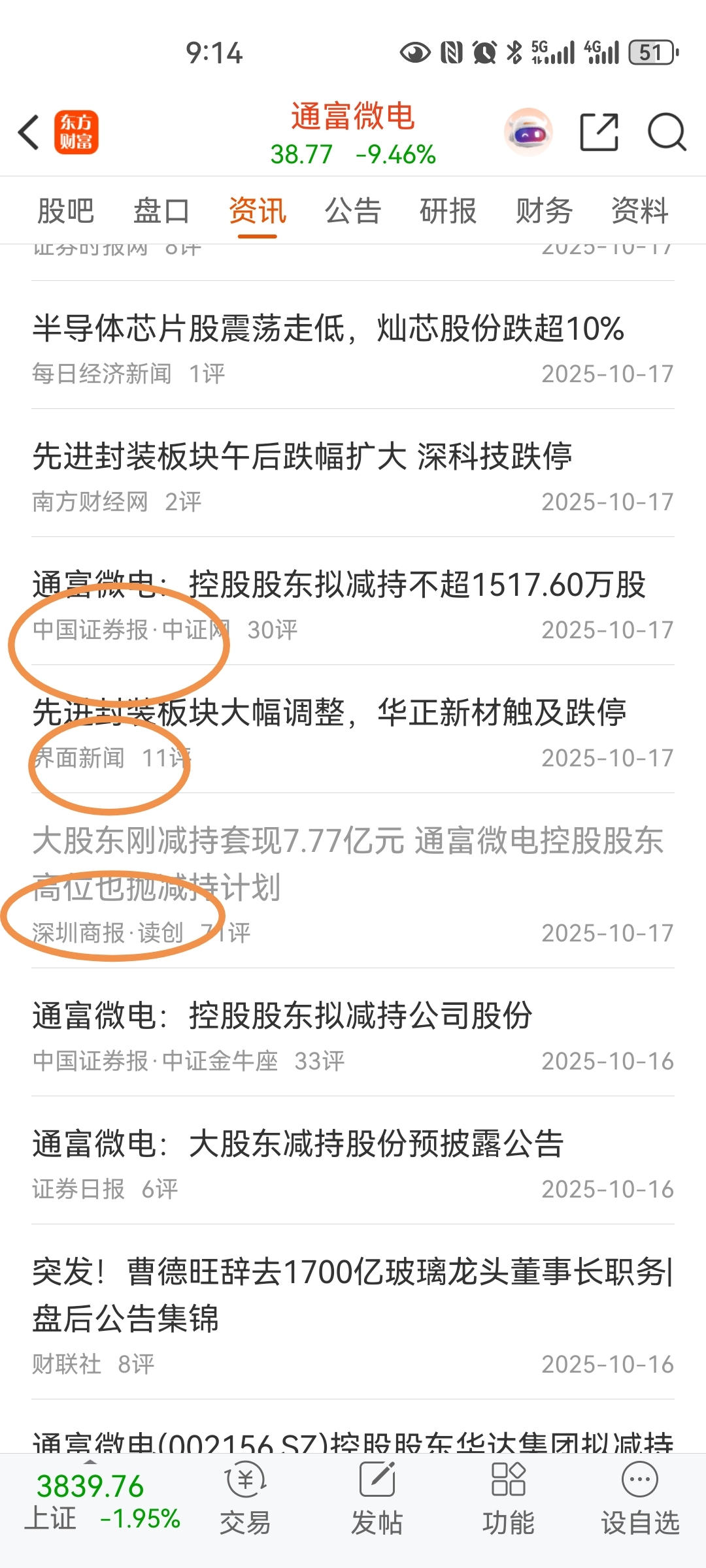 $通富微电(SZ002156)$ 实在有点看不下去了,吐槽两句哈。大家都去翻看今天的资讯,昨晚公司就发了一则关于控股股东减持不到1%的公告。坚持多正常的事儿,偏偏今天就兴师动众地发了三四篇减持公告大肆宣传,唯恐扫地阿姨都不知道这个事儿。你们是直接卖公司吗,至于这么得到处吹唢呐吗?减持很了不起吗?筹码我是不会交出去的。