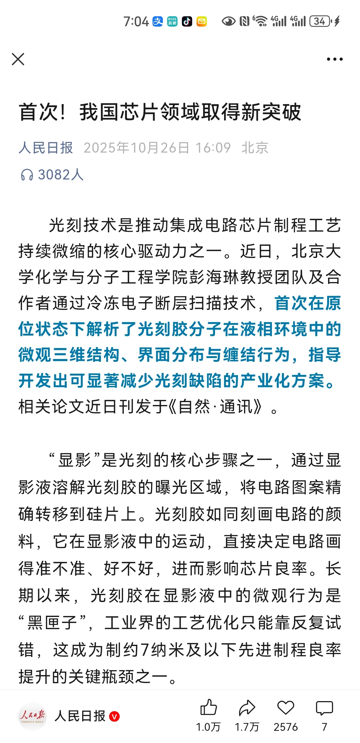 人民日报:芯片领域重大突破