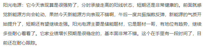 阳光电源:它周五也是反弹的大阳线,表现算是很强势了,同样是不负海哥前面的挖掘啊。上周,海哥反复分析了它基本面非常好,业绩预期向好,新能源方向还会轮动这些看法。实际上基本符合预期啊,阳光电源果然是再度走强。策略上,短期继续耐心跟踪了,趋势走的是一点毛病没有啊。阳光电源,这个是前面挖掘的,一直在坚守,最终还是按海哥预期出现走强。