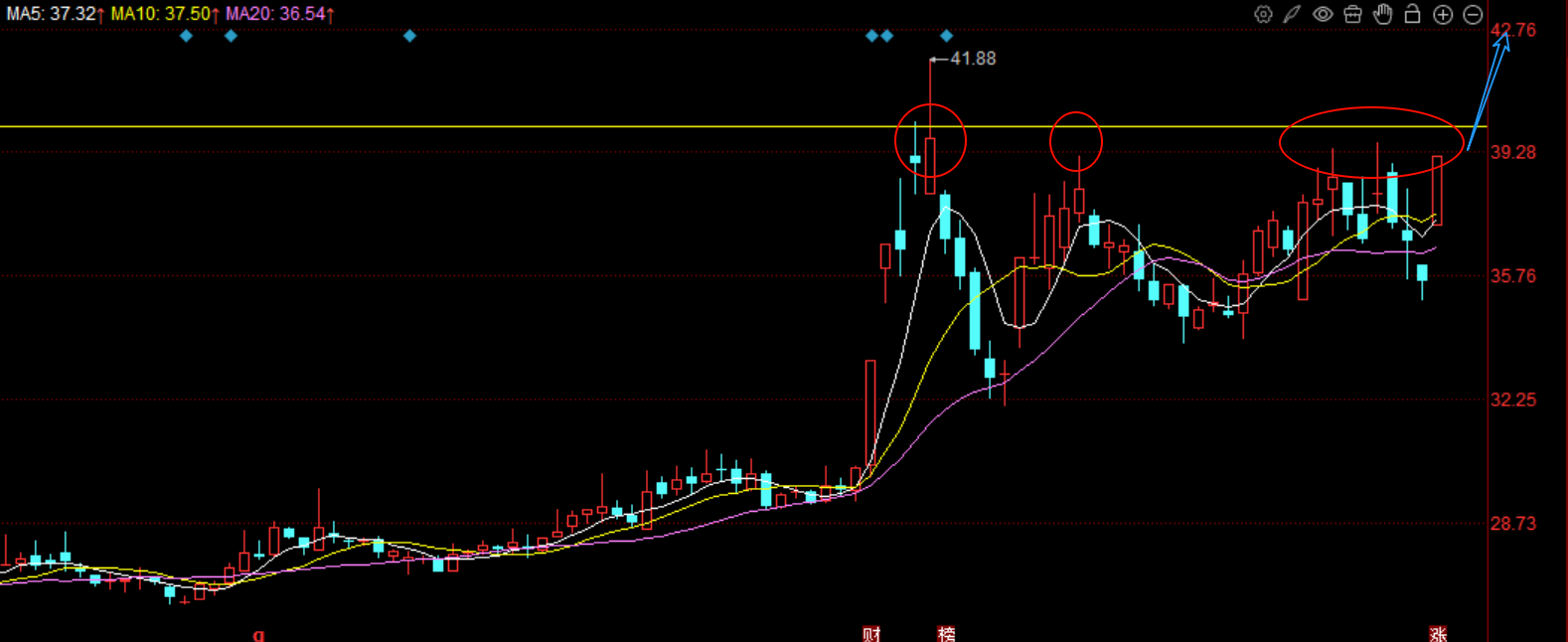 这次十五五最大的亮点就在于,提出了航天强帼的概念,这是新题材而且级别不小,未来将会有更进一步的利好出来。而且今年开始,商业航天优质公司都要相继上市,包括星河动力,蓝箭等等,可以看出行业正处于加速发展期。所以商业航天有望成为后续的主线。标的上,今天要留意中卫。这个是板块的容量核心,如果它能继续走强,那板块就要高看一眼。走势上,40块是长期的一个压力位,周五涨停之后是近在咫尺了,今天会借势突破这个压力位,然后就看回落的时候能不能站稳40块以上,如果能站稳,这里将转化为支撑位,后续回踩再起跳。策略上,量能还没有放出来,如果今天有4%以内的机会,可以吸筹博弈连板。