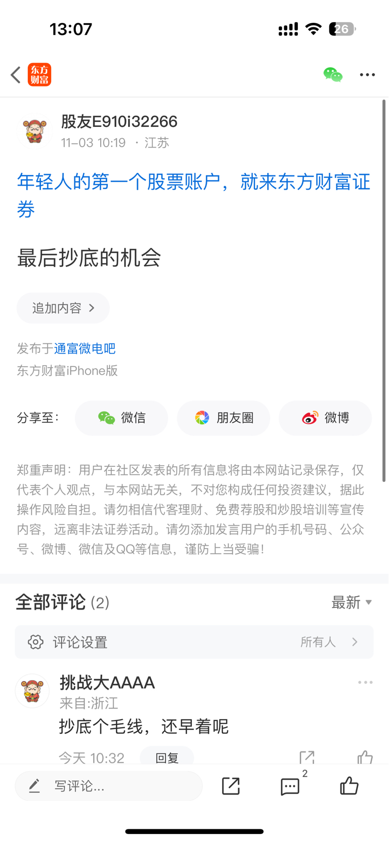 温馨提示: 1.根据《证券法》规定,禁止编造、传播虚假信息或者误导性信息,扰乱证券市场;2.用户在本社区发表的所有资料、言论等仅代表个人观点,与本网站立场无关,不对您构成任何投资建议。用户应基于自己的独立判断,自行决定证券投资并承担相应风险。《东方财富社区管理规定》