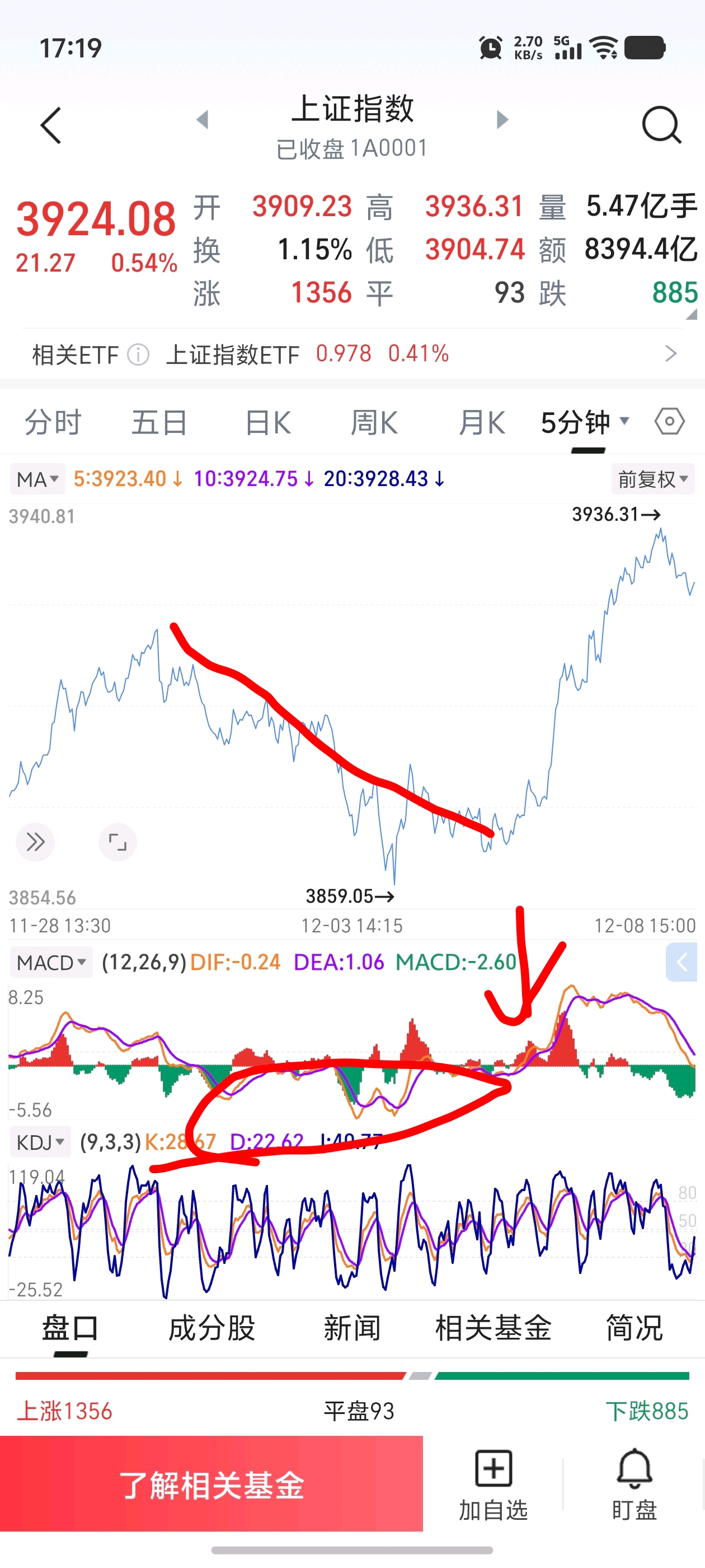 继续分析指数,至少说过macd上穿0轴定义为多头,如果你按5分级别,今天尾盘是卖