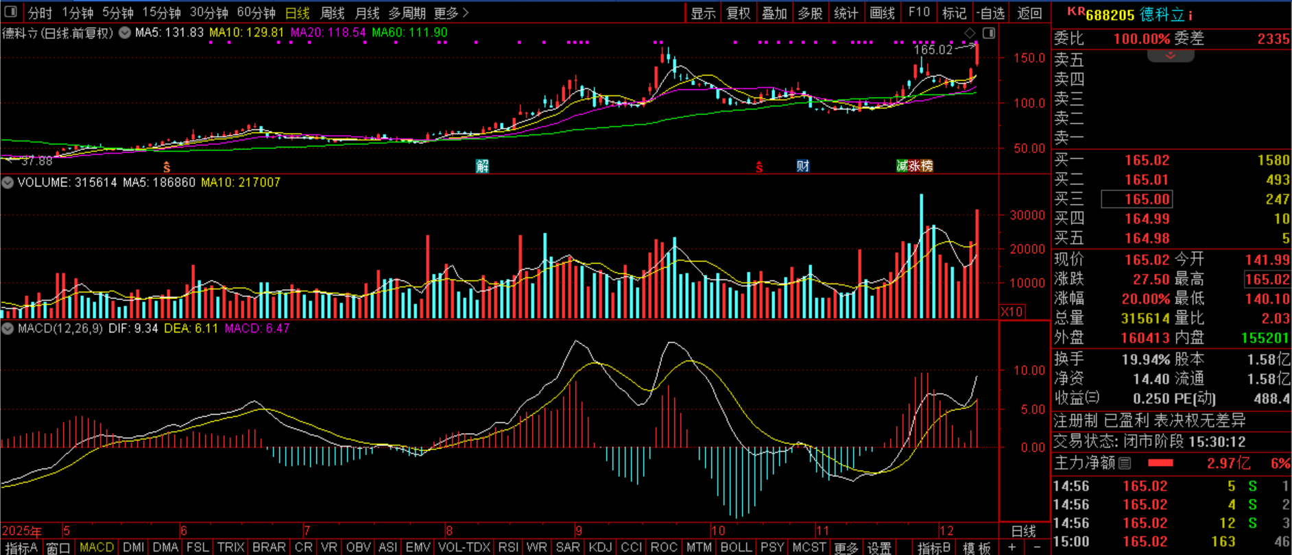 德科立(KC688205):S股上市+光模块+全球化+中兴通讯+800G光模块+CPO+数据中心+薄膜铌酸锂。昨日该股放量封板新高,这是典型的突破行情,料后市继续高走,新的上涨空间打开。当然由于刚刚突破,这种形态很容易失败。因此今日很重要,预计今日该股有望继续走涨新高,如果能稳定在161.50上方附近的话,该股突破有效,分歧走水的话,可以深度研究探索。