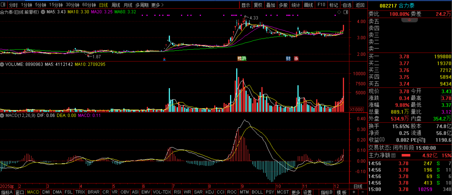 合力泰(SZ002217):扭亏+电子纸+算力+福建国资+国改。该股近期最大的亮点:一、该司前三季度利润同比大增23.84%;二、与重整投资人合资设立子公司进军算力,而这个又是当前未来发展的重点,缺口巨大,由此可知,该股的估值具备上修空间。从技术上来说,该股自从9月上旬开启调整以来,已经一个季度,该股最低至2.98,不过始终未能跌破,而其底部抬升,这是要出趋势的迹象。昨日该股放量拉涨封板,上涨趋势基本形成,料后市新的上涨有望开启。预计今日该股有望继续走涨,分歧走水的话,机遇多余风险,值得研究。如果后市能够顺利突破4.33的话,该股新突破行情启动,新的上涨空间打开。