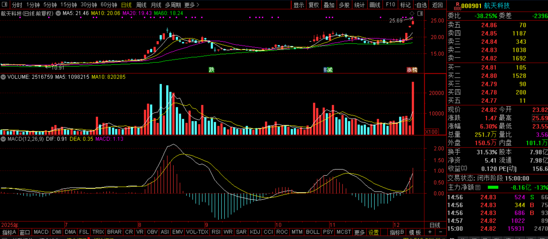 航天科技(SZ000901):商业航天+卫星导航+央企+航天应用+车联网+中报预增。昨日此股放量冲高,虽有回落,不过依旧是处于近期高位,突破态势中,因此昨日的走势仍是良性上涨,是趋势的强化与延续。而一般放量回撤均可能迎来强势调整。因此笔者认为今日该股有望强势分歧探底,然后走升,如果依旧稳定在昨日高点附近的话,该股突破获得确认,后市继续走高无忧。