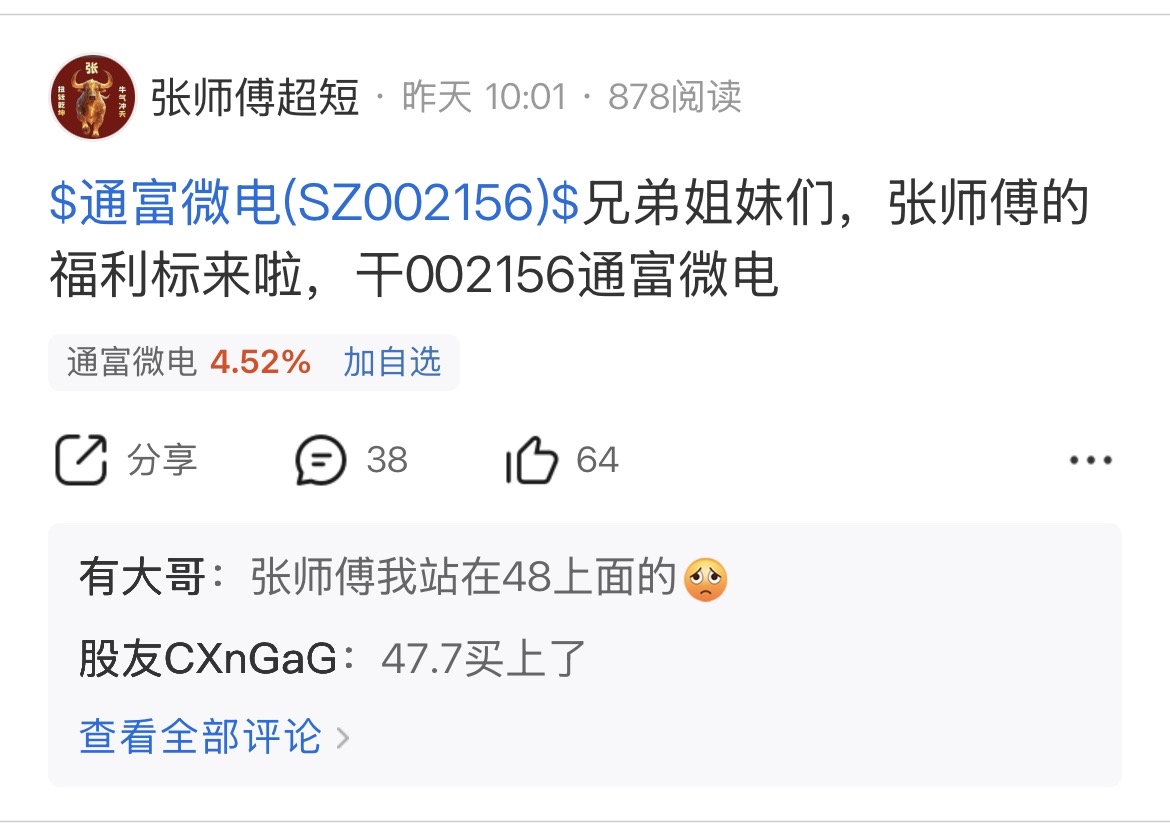 $通富微电(SZ002156)$ 张师傅做事向来光明磊落,绝不做马后炮,盘中所有的标都经得住考验,我们的胜率也是很高的,大家有目共睹,今天我本不想推福利标的,想等利欧出来在统一上车,但如果突破500个赞我依然可以公开,大家在哪里